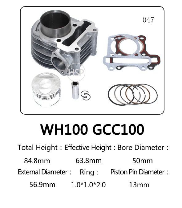 Motorcycle Parts Cylinder Block Kit for Honda WH100 (GCC100) WH110 (GGC110) Product NameCylinderModel WH100(GCC100)/WH110(GCC110)Bore Size50.00mmTotal Height84.80mm/90.50mmFace To Face Height63.80mm/73.00mmPiston Pin13.00mmPiston Ring1.0*1.0*2.0/0.8*0.8*1.5(mm^3)MaterialAluminumColorSilver/Gray/Blac......